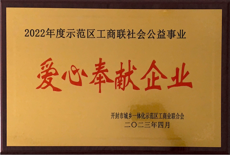 近日,開封市城鄉(xiāng)一體化示范區(qū)工商業(yè)聯(lián)合會向我公司頒發(fā)了2022年度示范區(qū)工商聯(lián)社會公益事業(yè)“愛心奉獻企業(yè)”榮譽證書,這是對我公司積極履行社會責任的一種充分肯定。